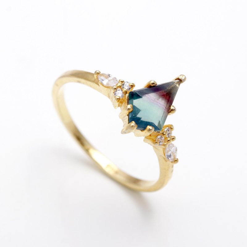 Natural Rainbow Fluorite Kite Statement Ring 14K Gold Anniversary Jewelry Birthday Gift