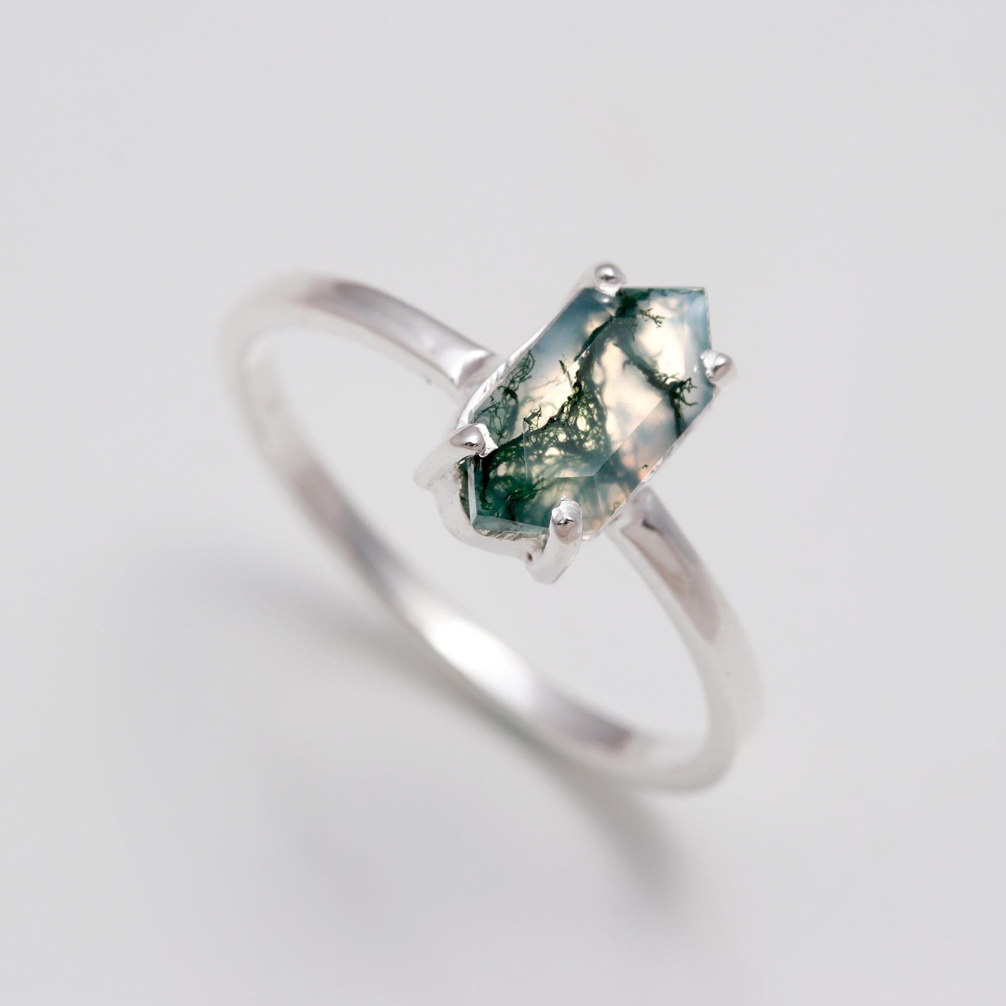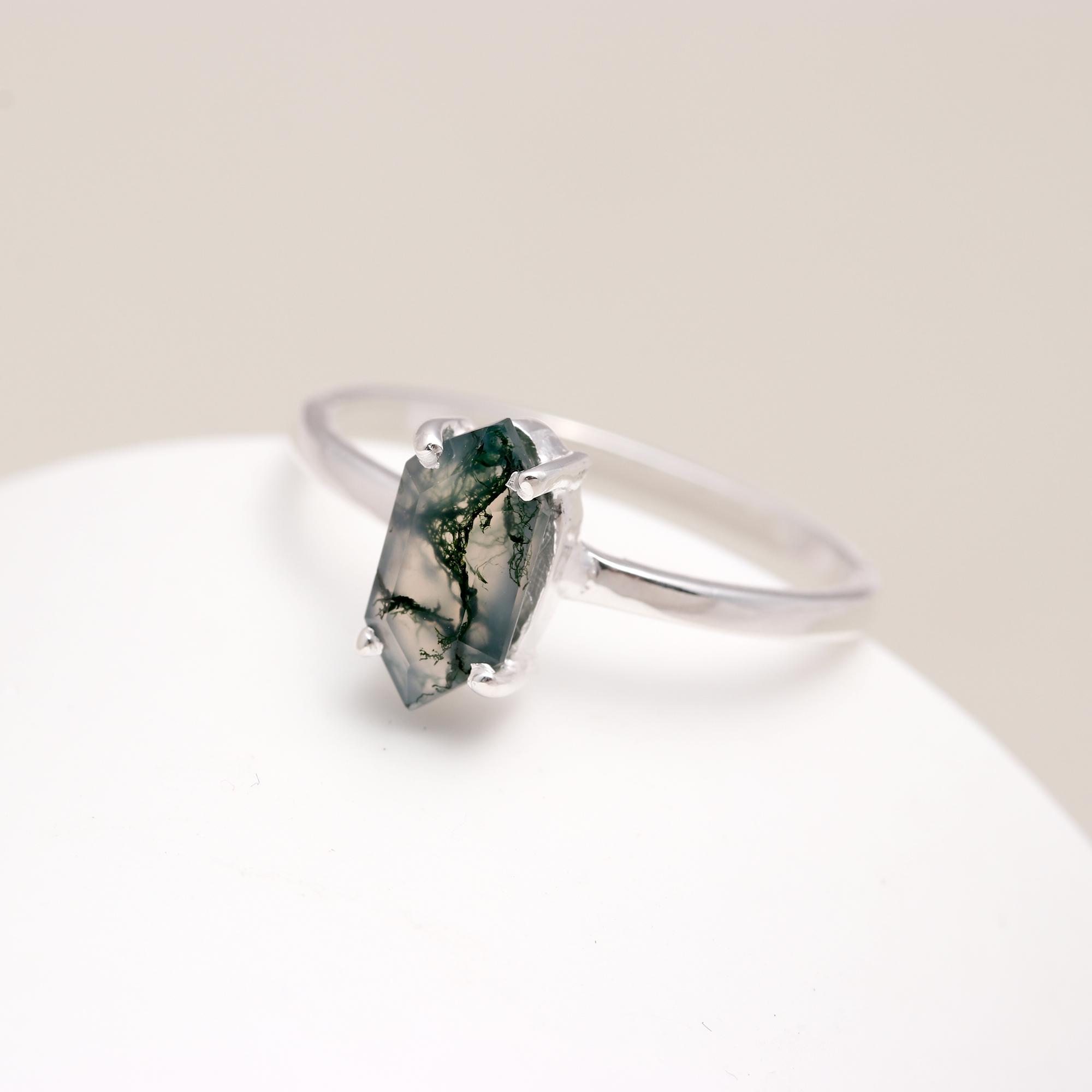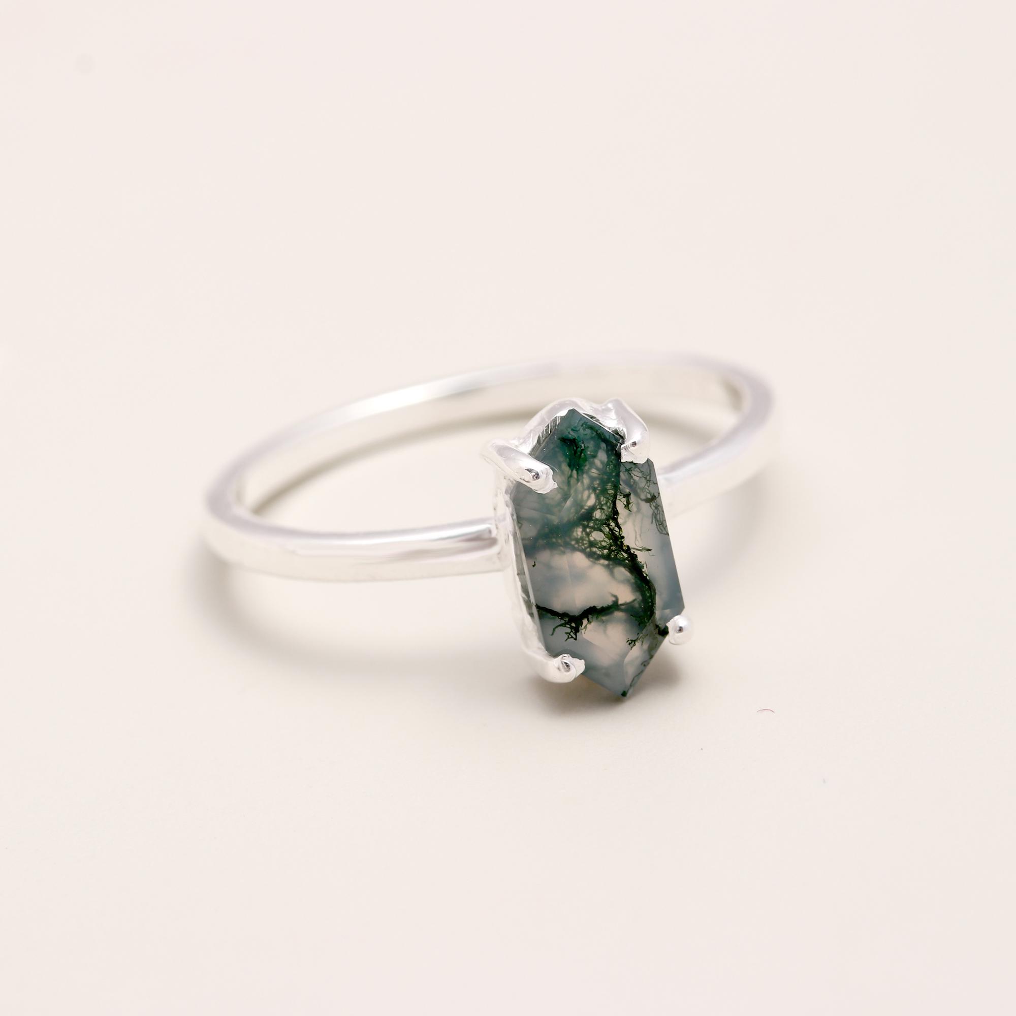 Natural Garden Moss Agate Elongated Hexagon Ring 925 Sterling Silver Delicate Jewelry Valentines Gift