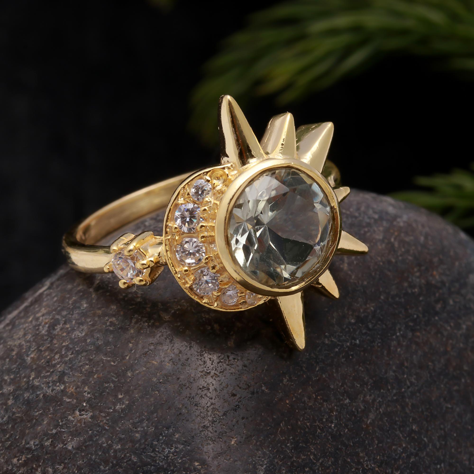 Natural Green Amethyst Round Shape Ring, 14K Gold Chunky Jewelry, Healing Crystal Ring, Sun & Moon Design Ring, Handmade Ring, Birthday Gift