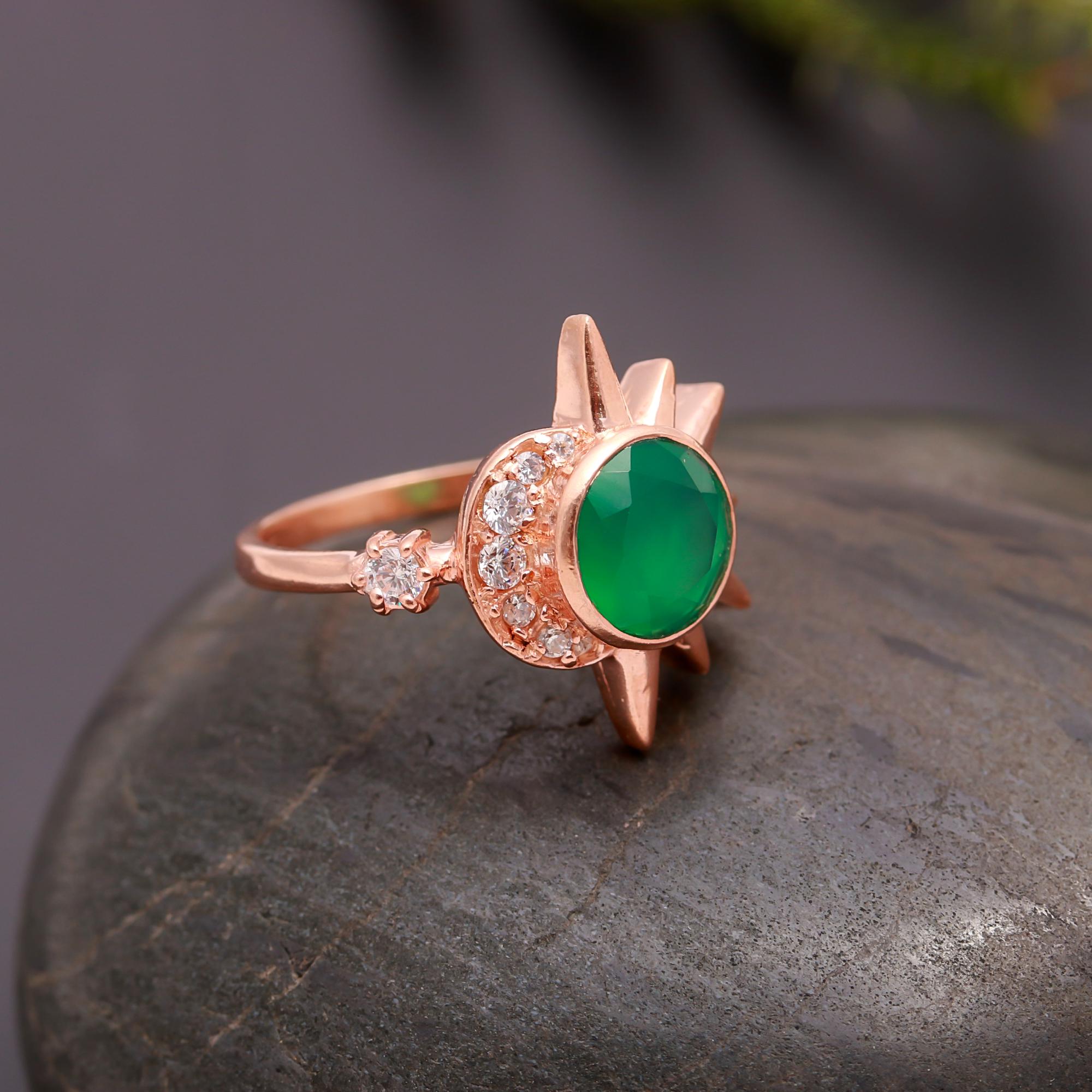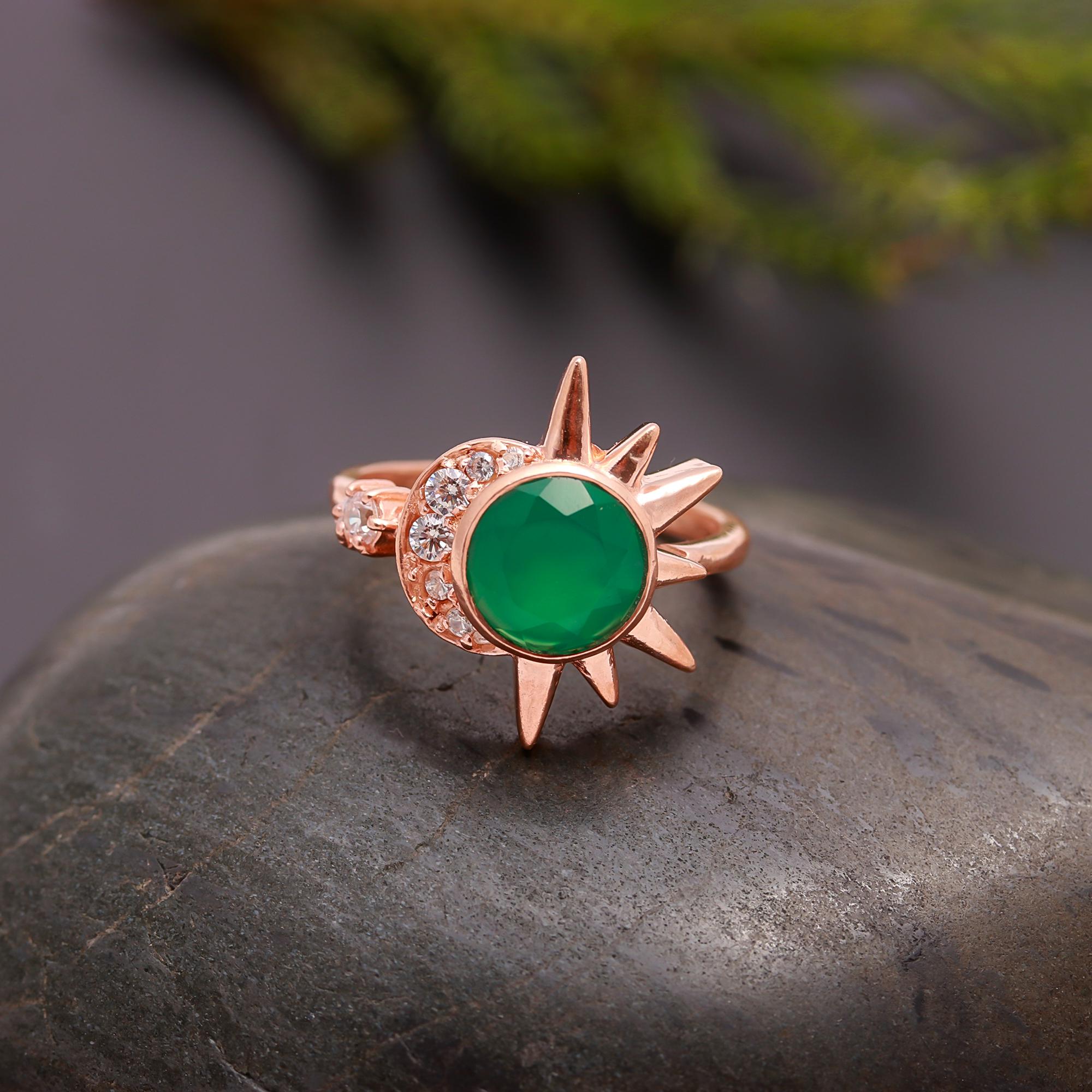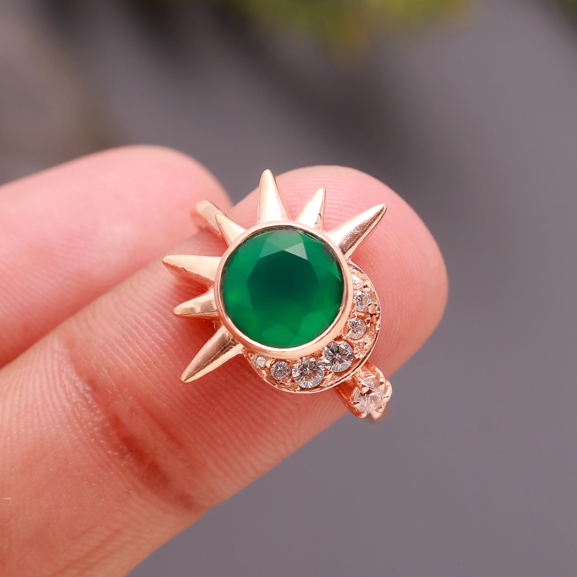 Natural Green Onyx Round Sun & Moon Ring, 925 Sterling Silver Rose Gold Plated Jewelry, Green Agate Sun Moon Ring, Birthday Gift For Lover