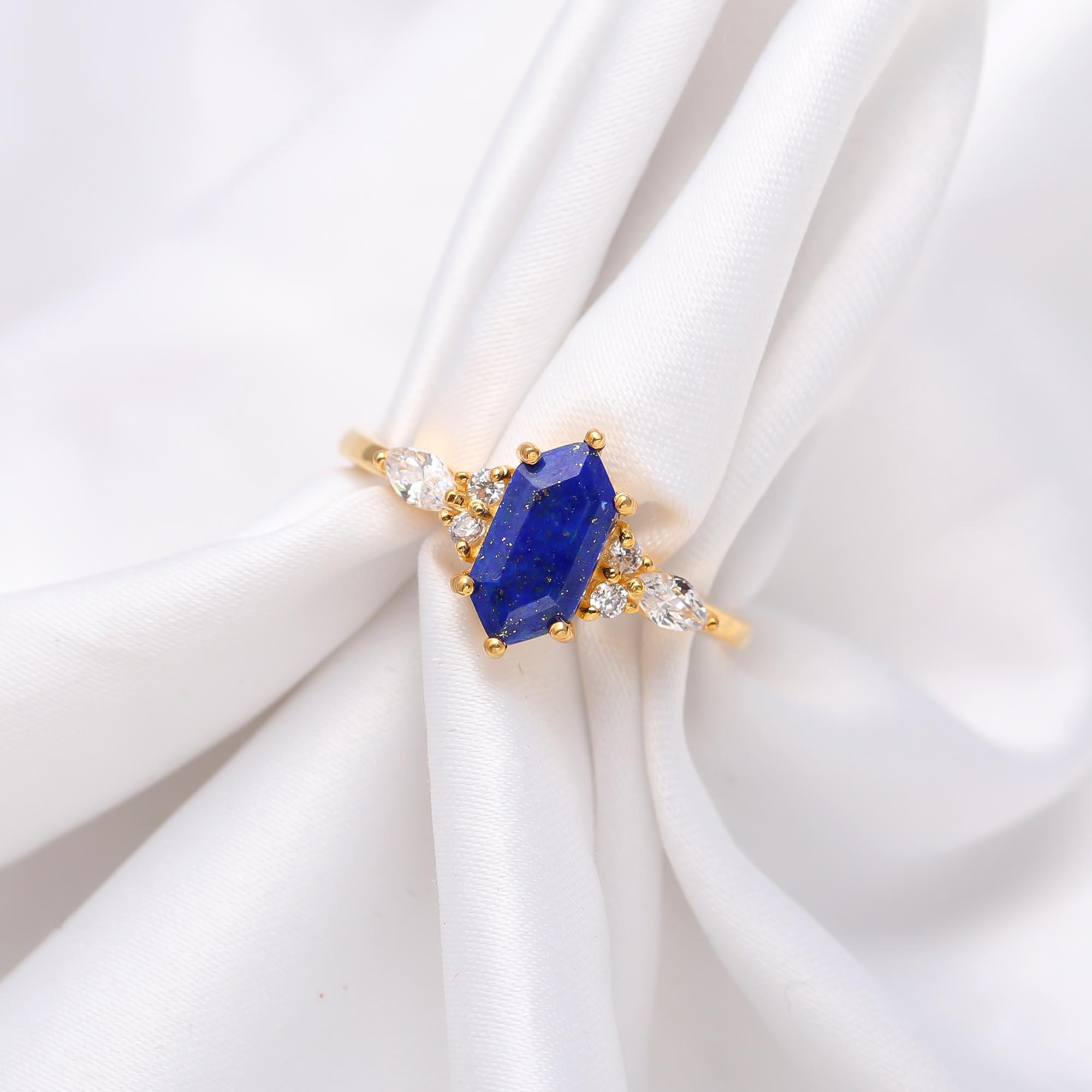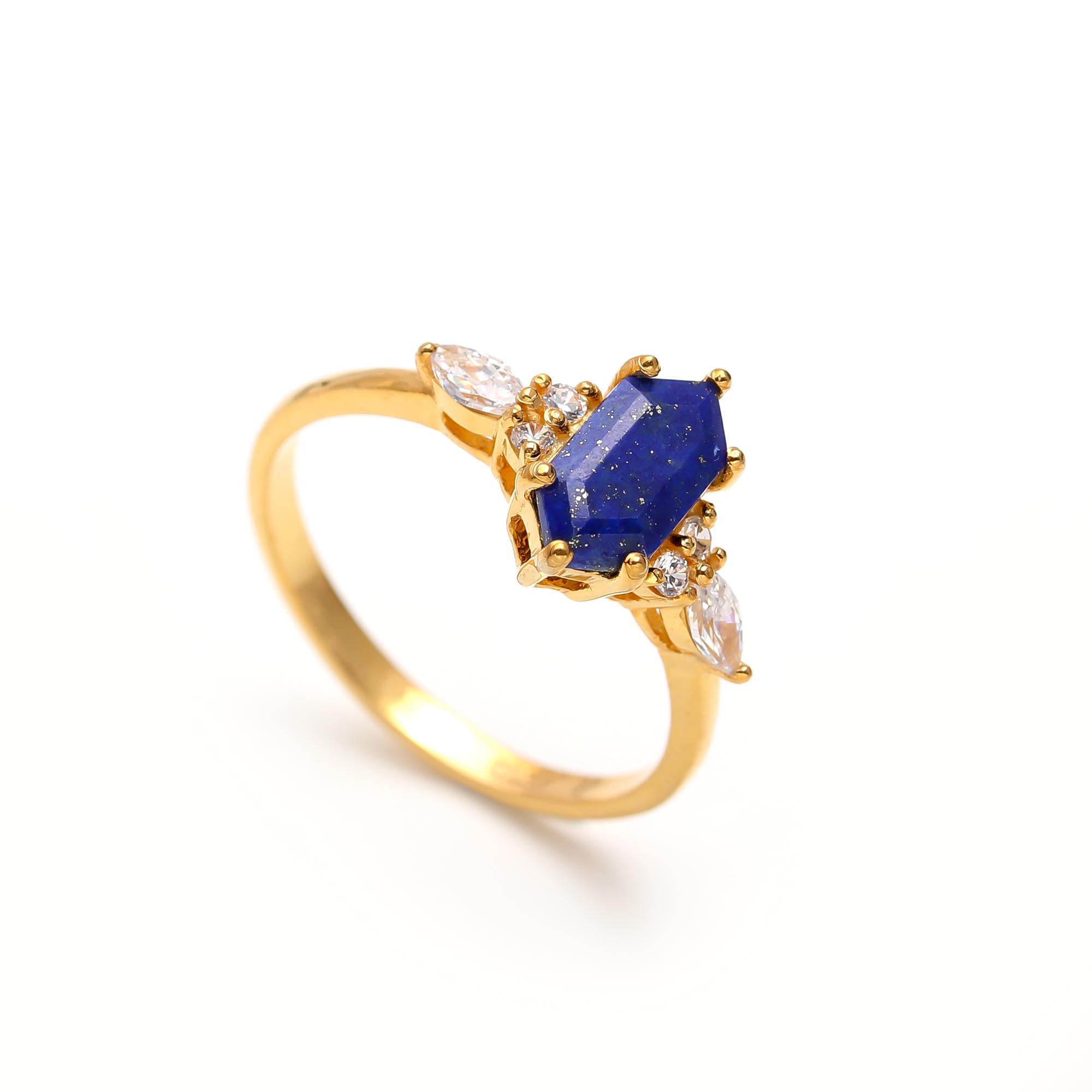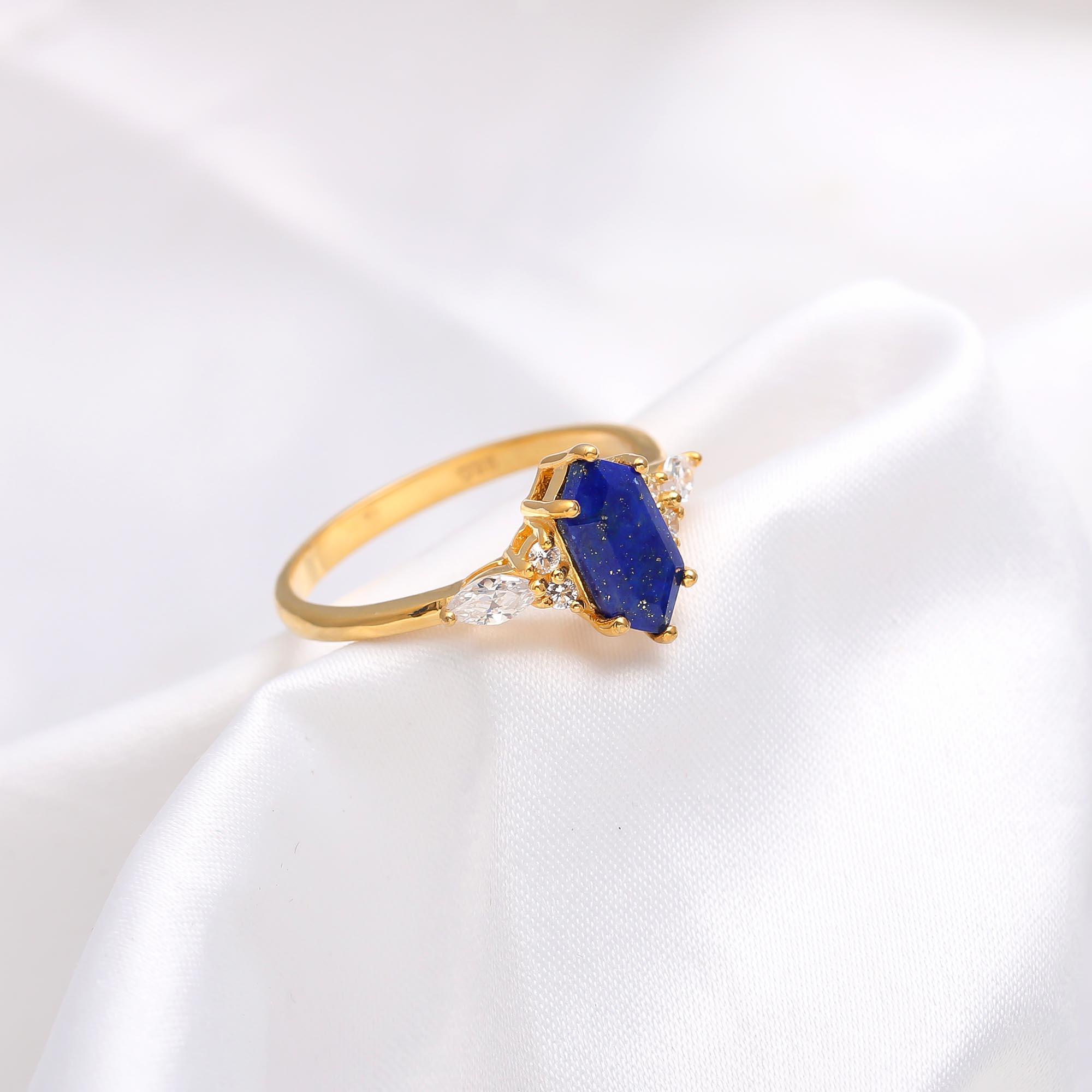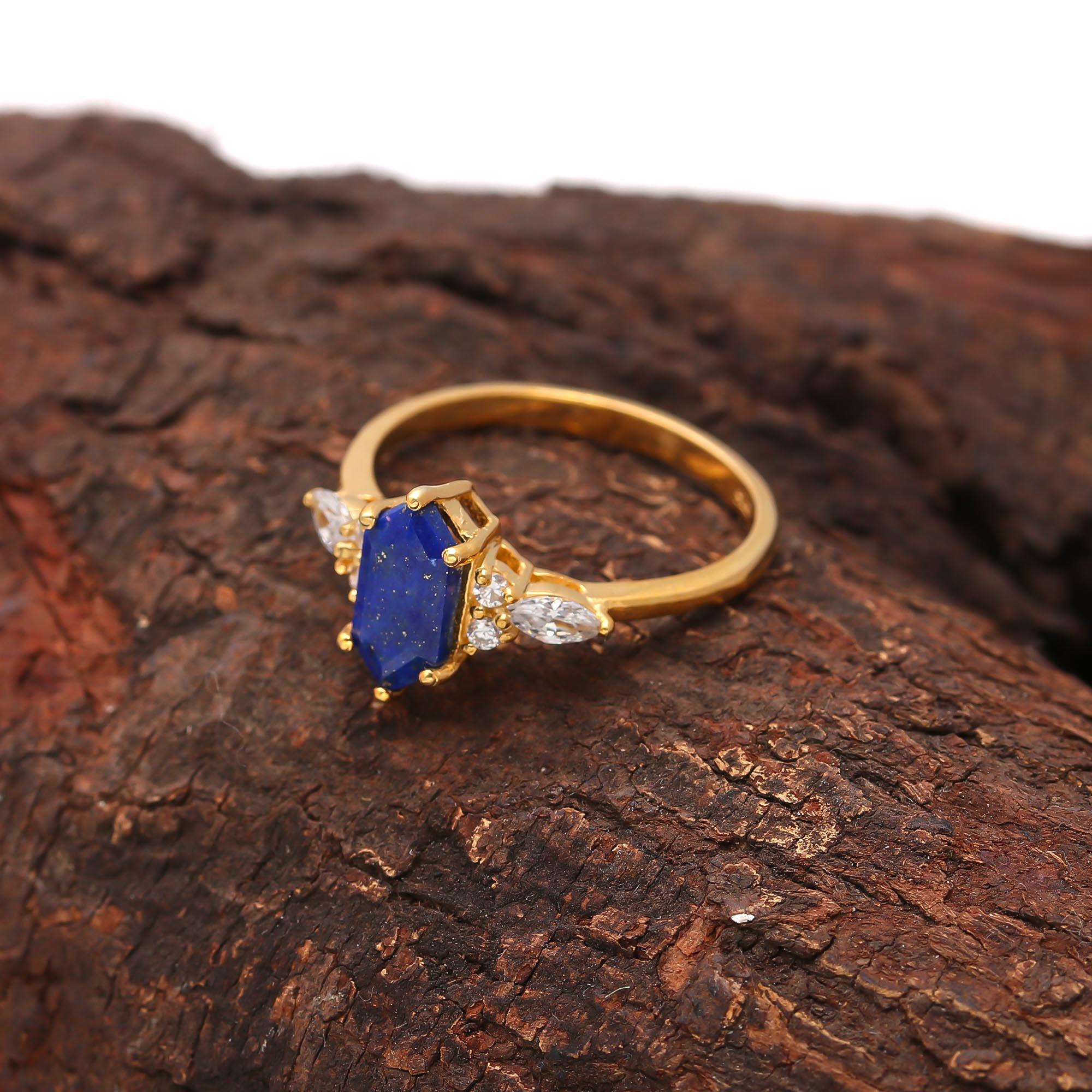 Natural Lapis Lazuli Elongated Hexagon Elegant Ring 14K Gold Jewelry For Wife
