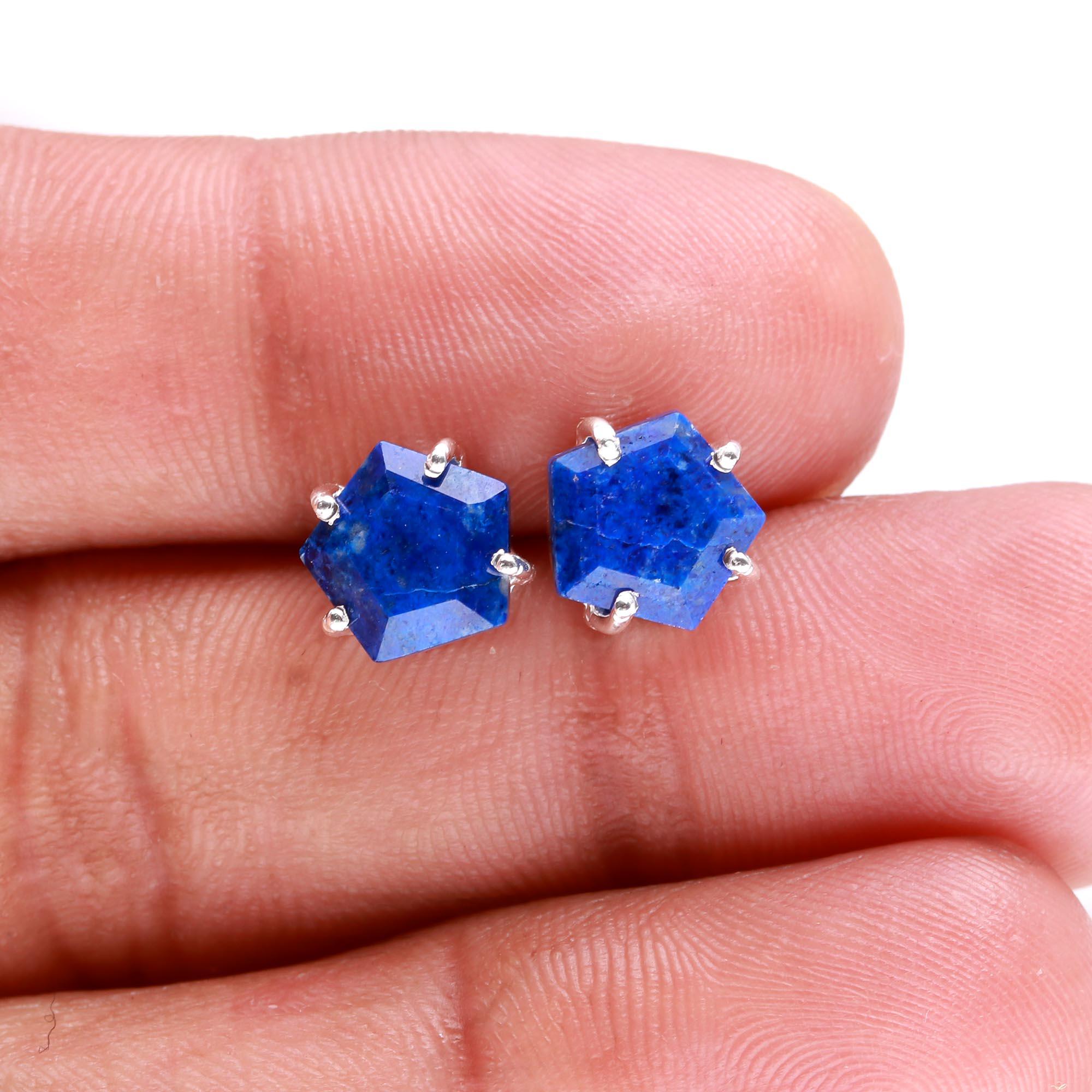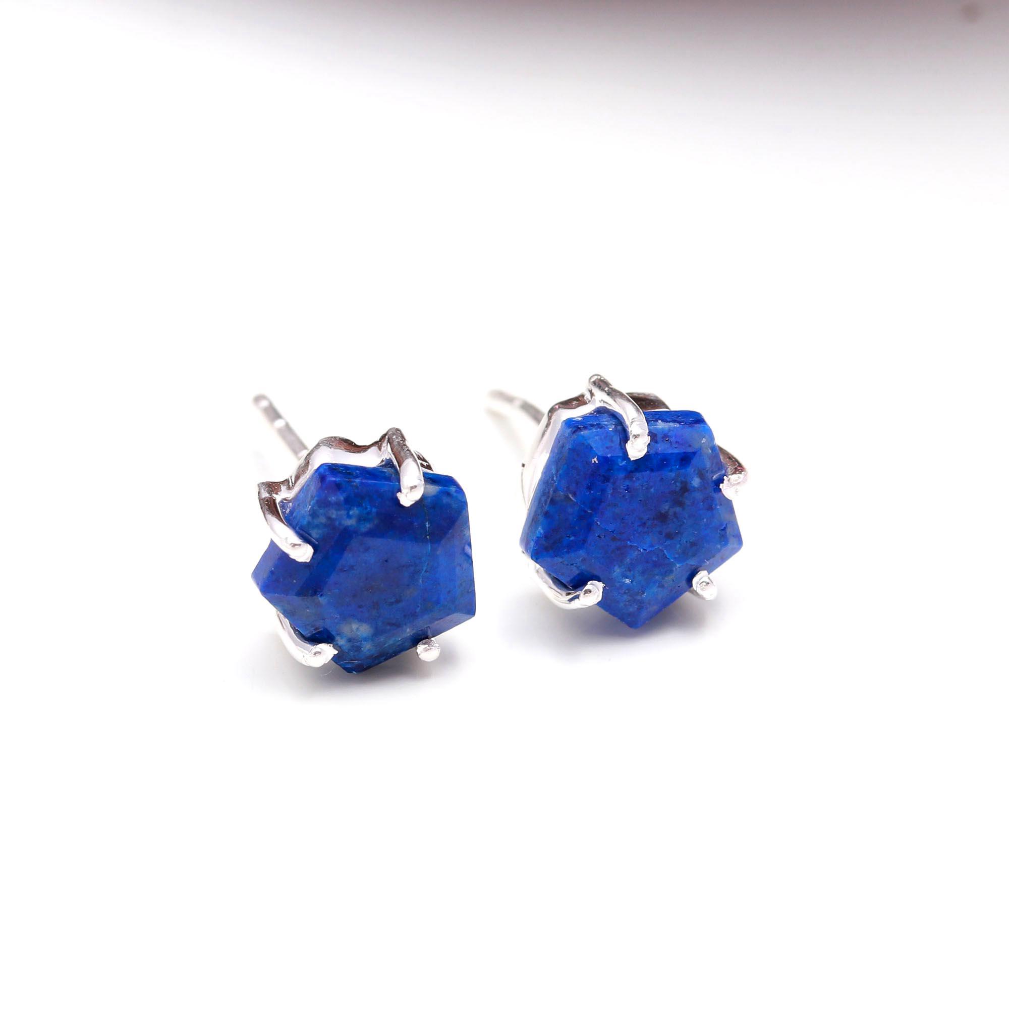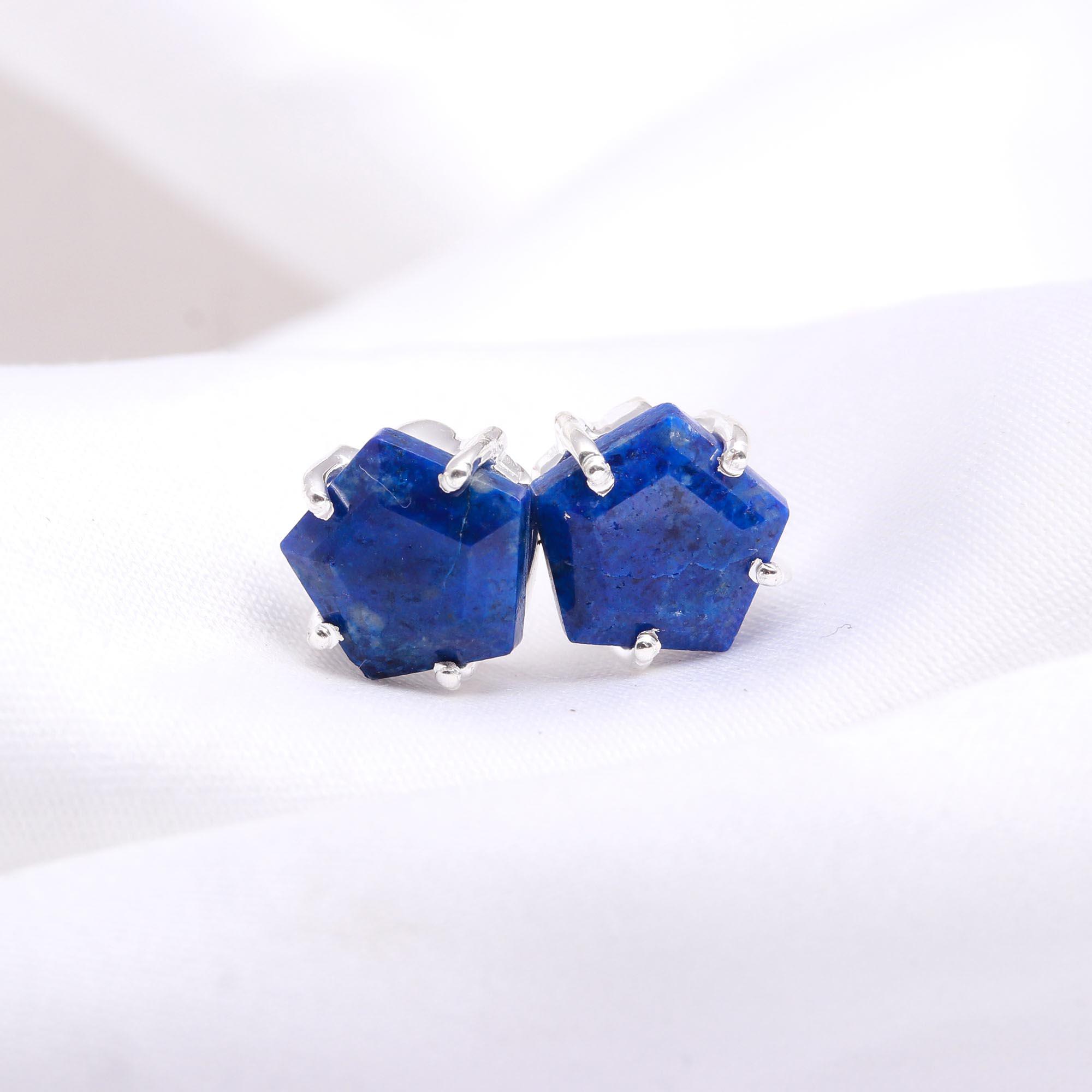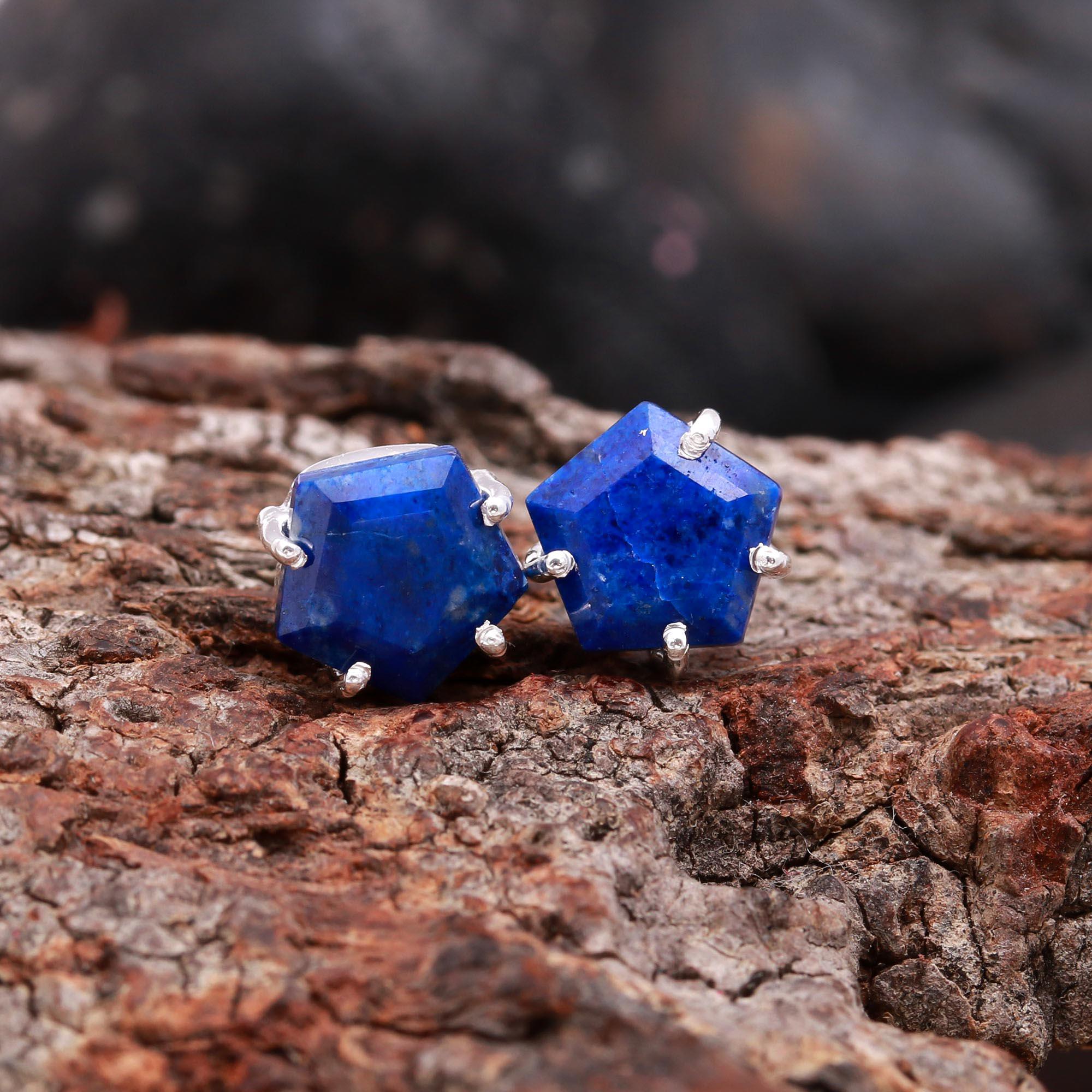 Natural Lapis Lazuli Pentagon Vintage Stud Earrings 925 Sterling Silver Birthday Gift