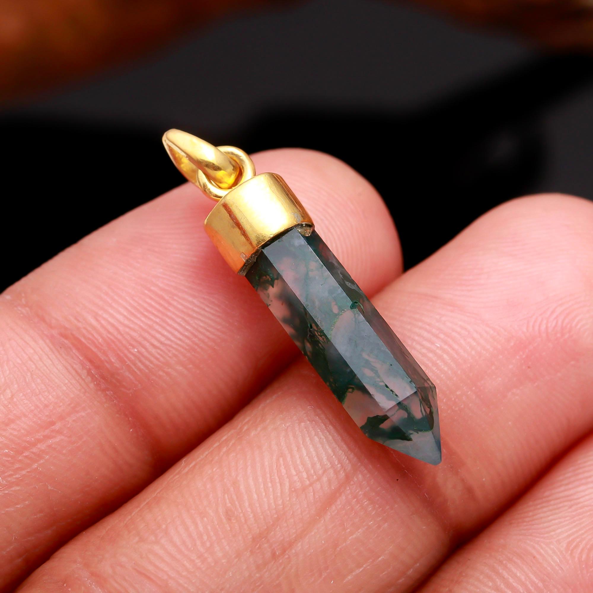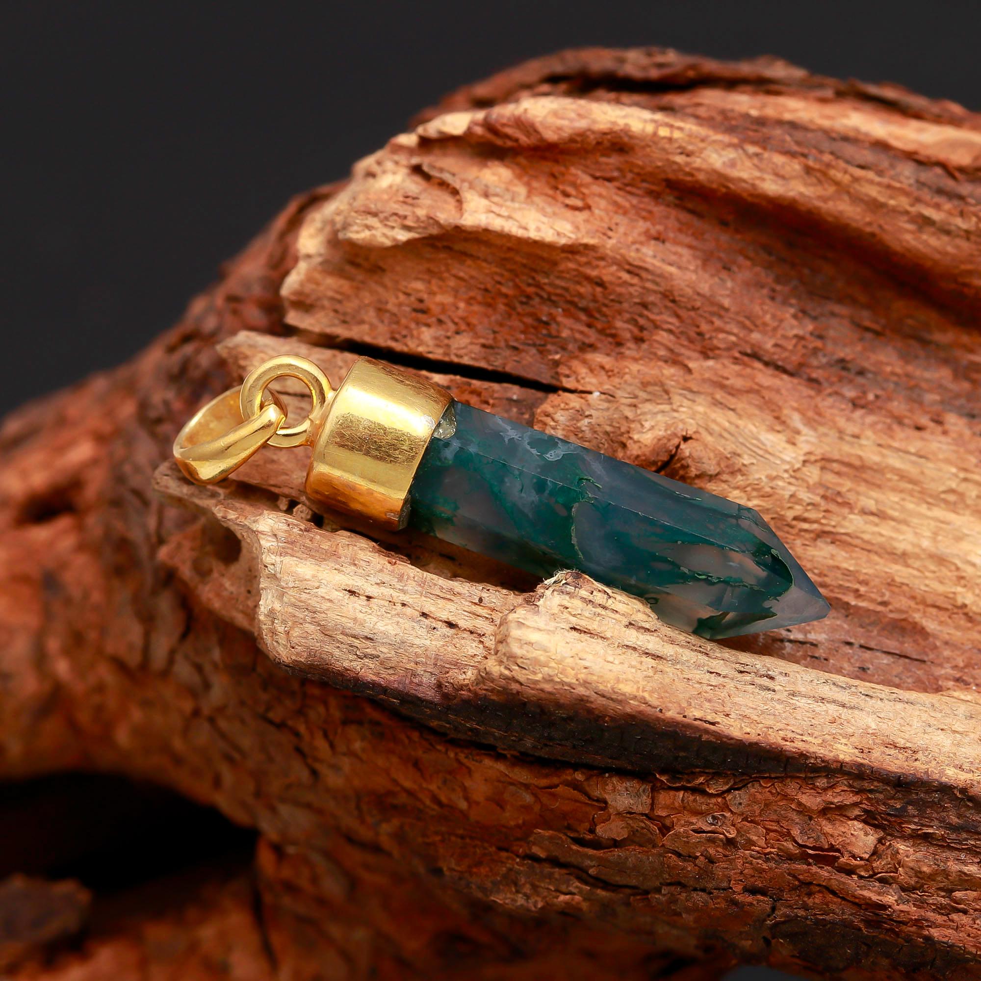 Natural Moss Agate Pencil Shape Charm Pendant Handmade Gold Jewelry