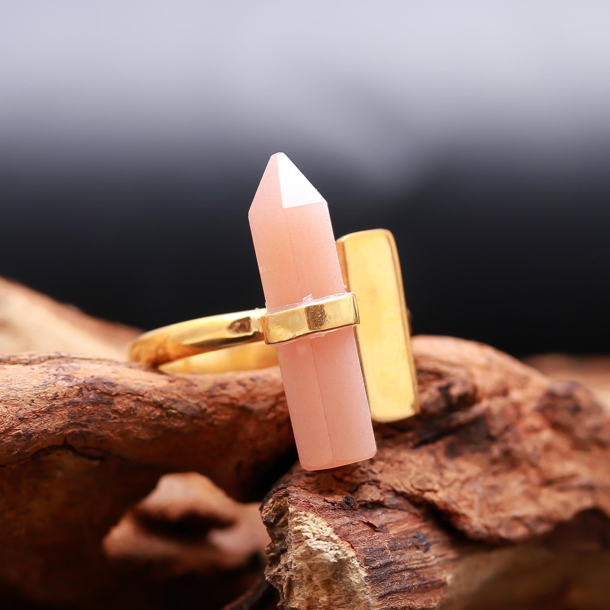 Natural Peach Moonstone Pencil Ring Statement Gold Jewelry For Her Wedding Gift