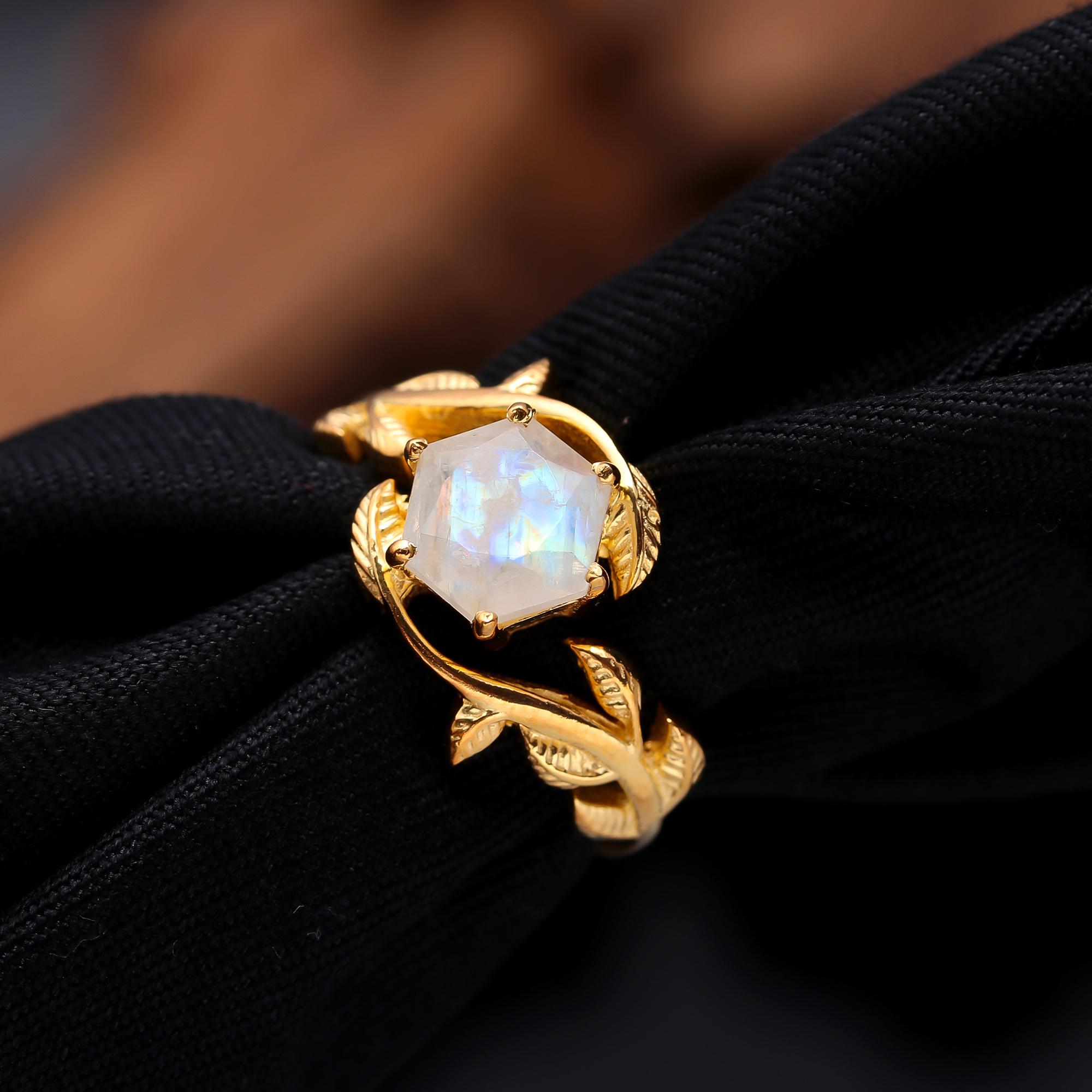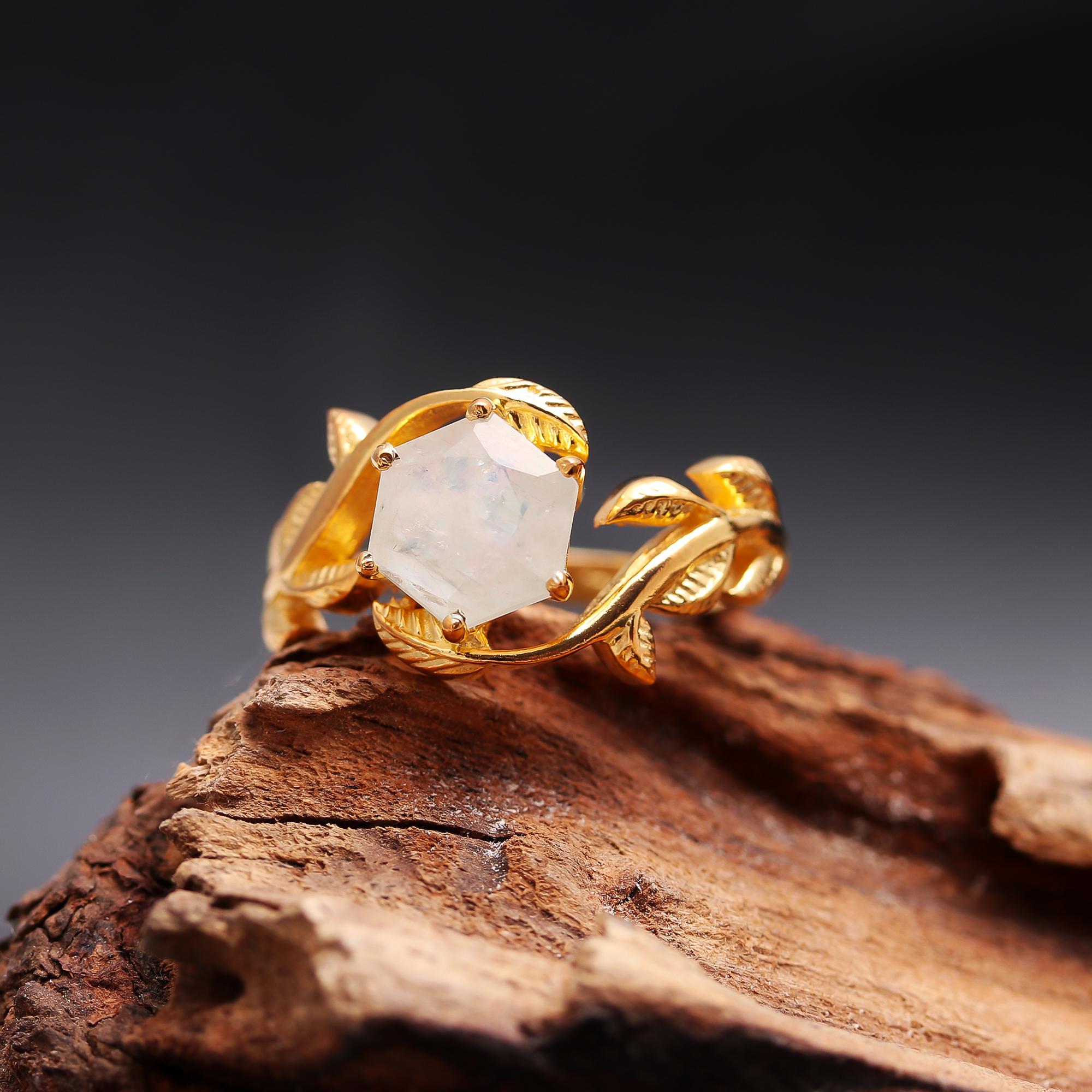 Natural Rainbow Moonstone Leaf Ring Hexagon Cut Ring Healing Gold Jewelry Birthday Gift