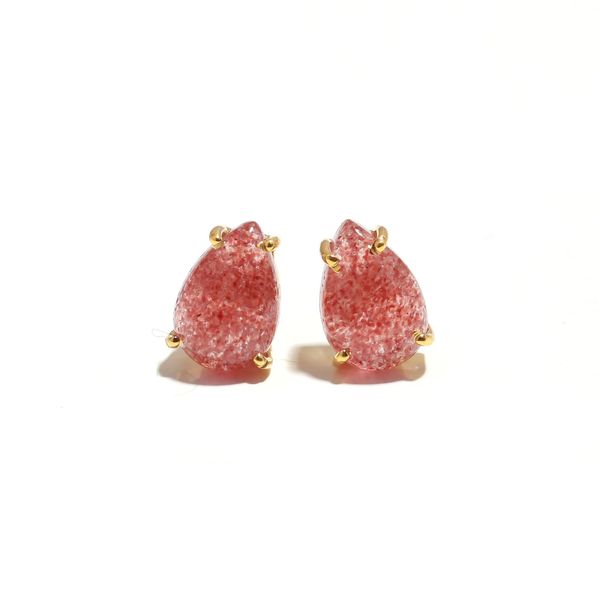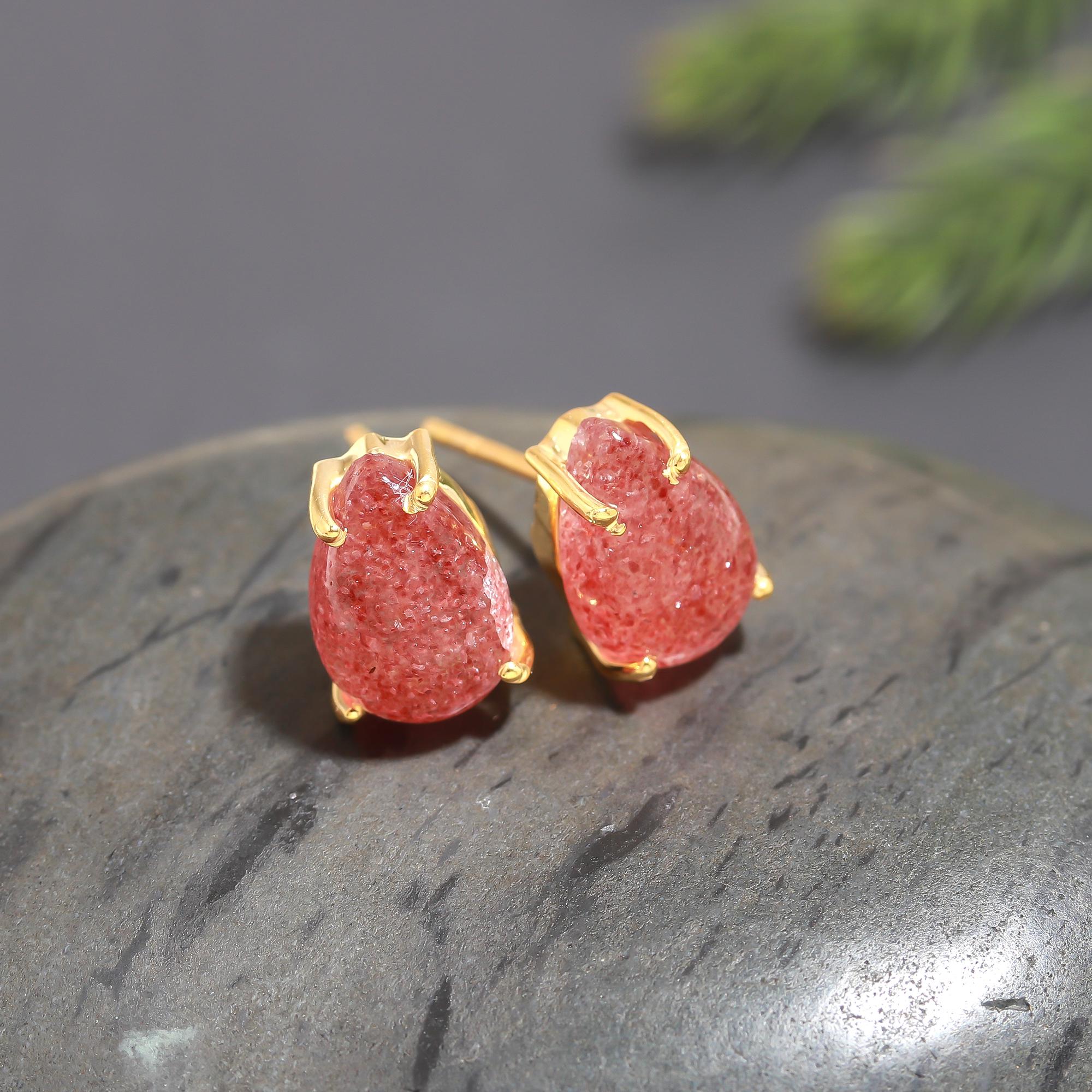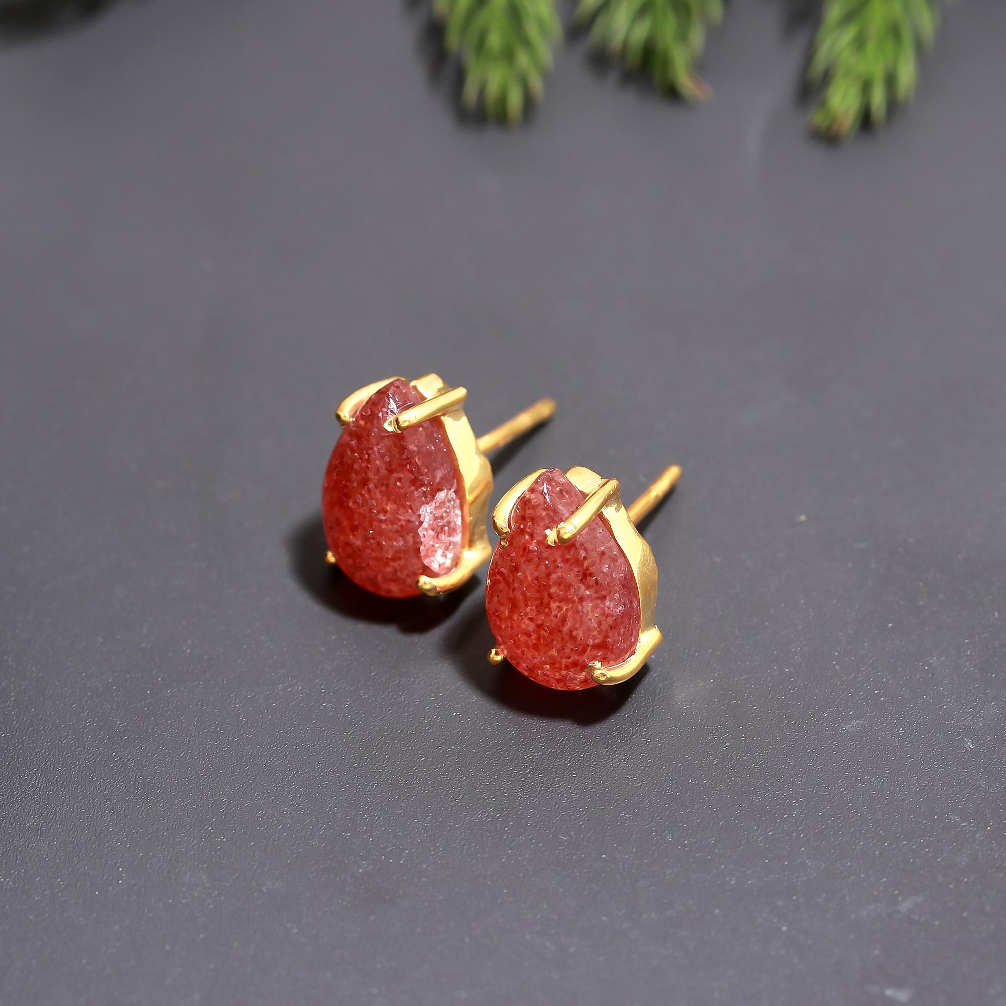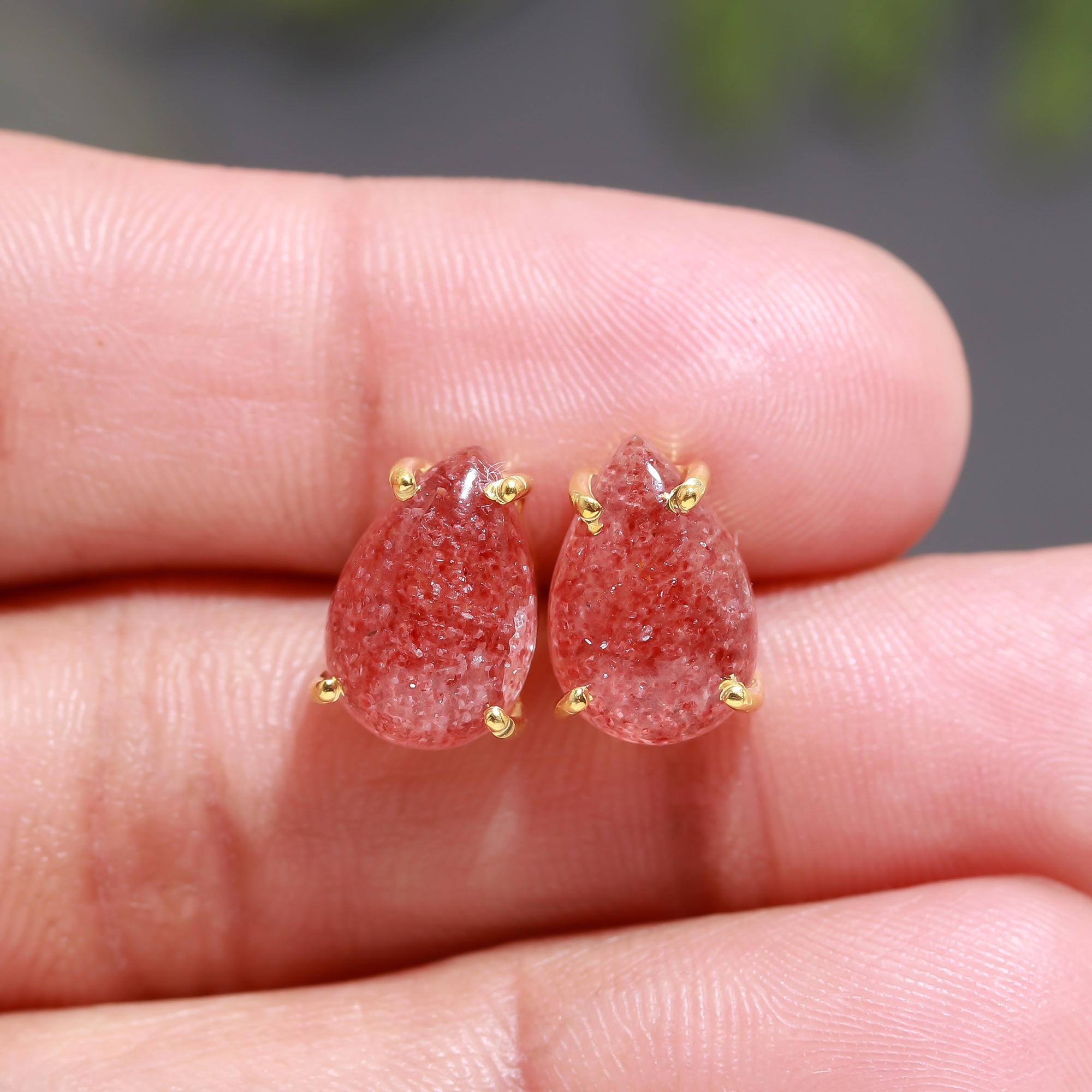 Natural Strawberry Quartz Pear Stud Earrings, 14K Gold Vintage Jewelry, Designer Studs, Bohemian Studs, Minimalist Studs, Birthday Gift