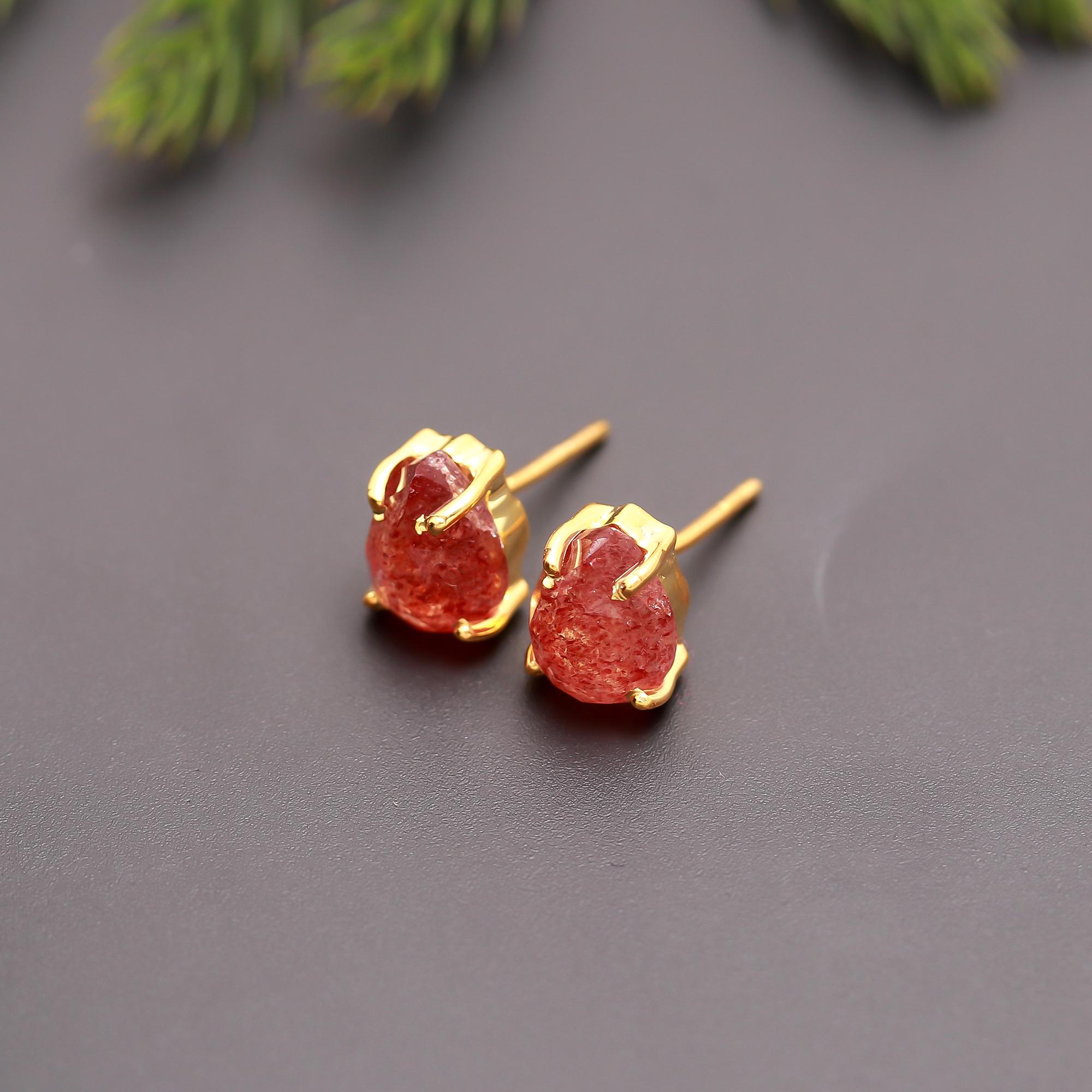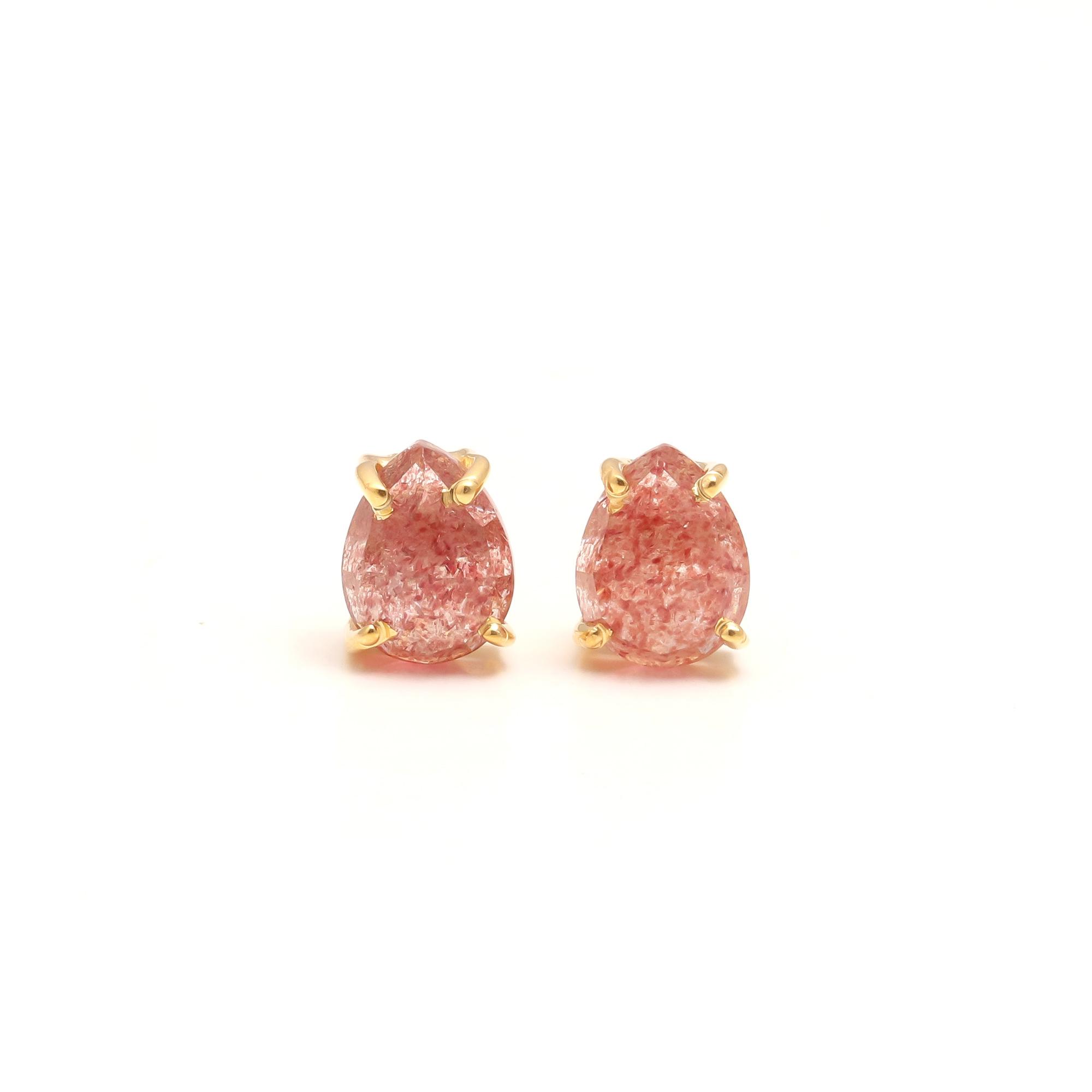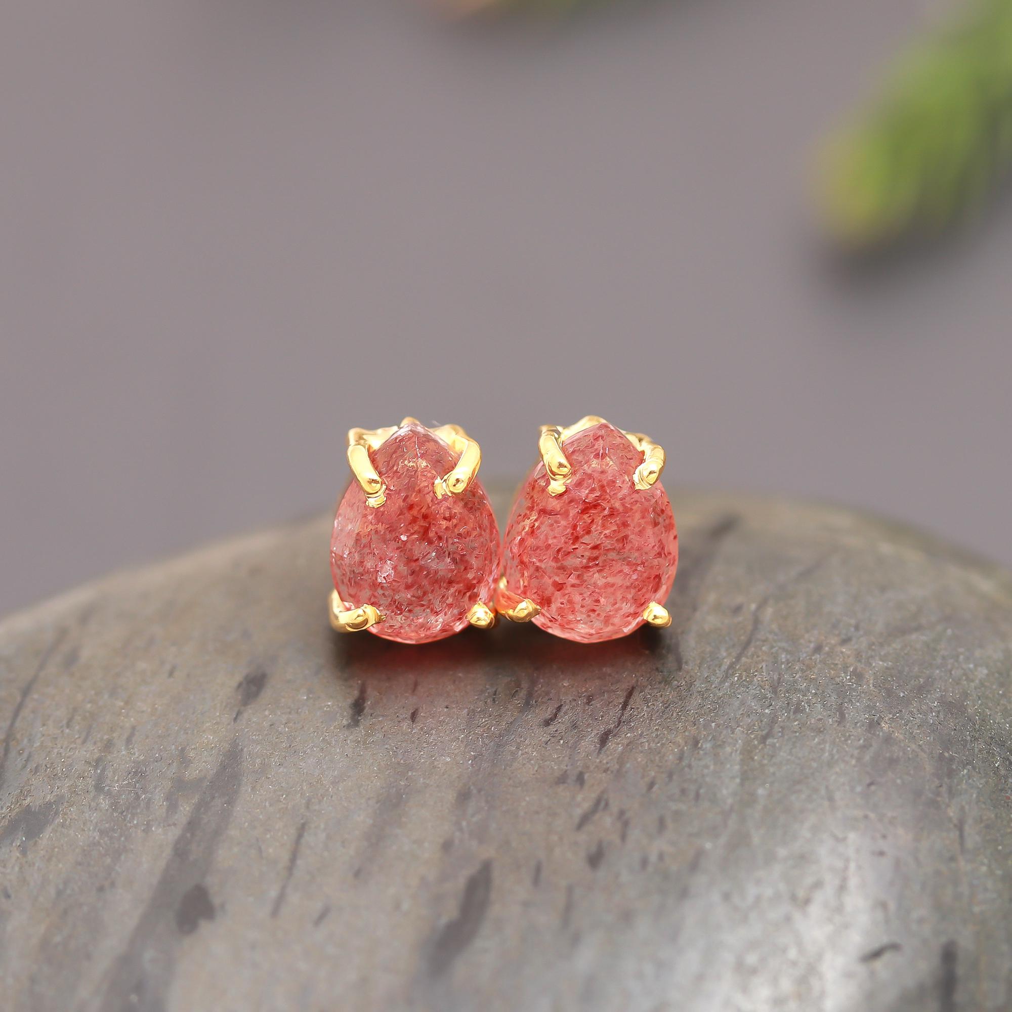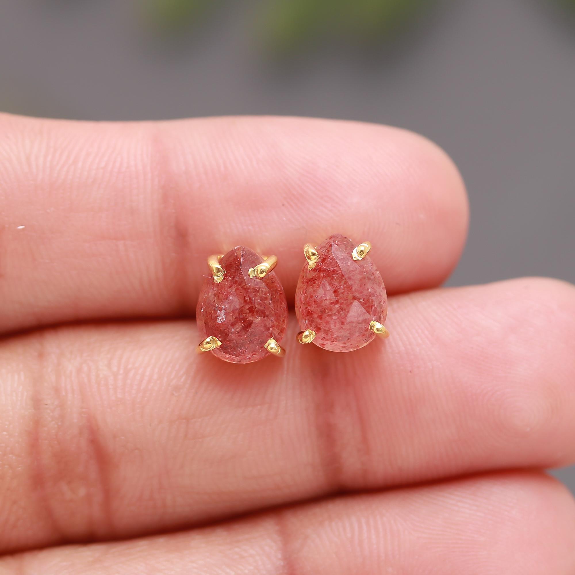 Natural Strawberry Quartz Pear Stud Earrings, 14K Gold Vintage Jewelry, Designer Studs, Bohemian Studs, Minimalist Studs, Birthday Gift