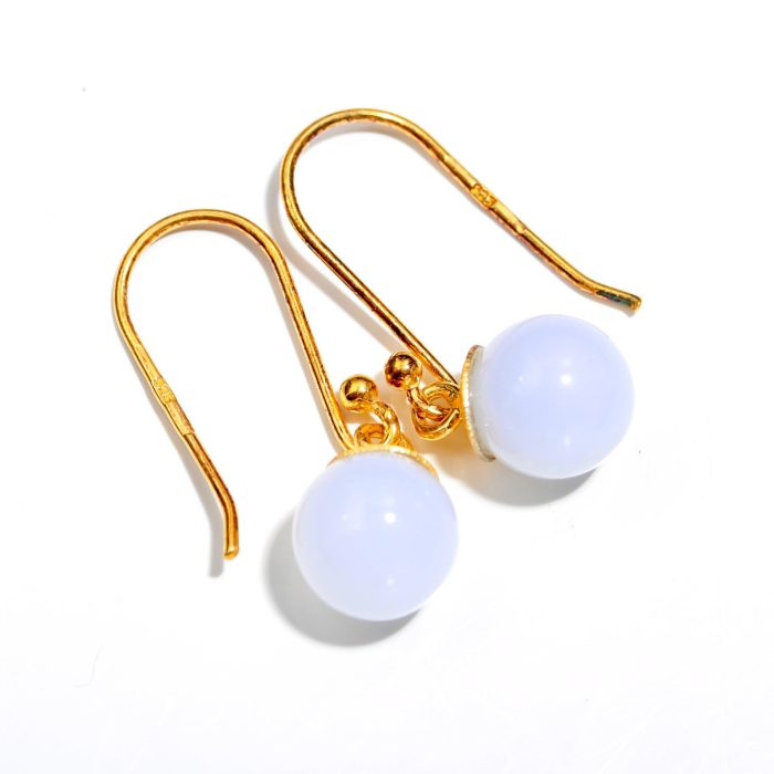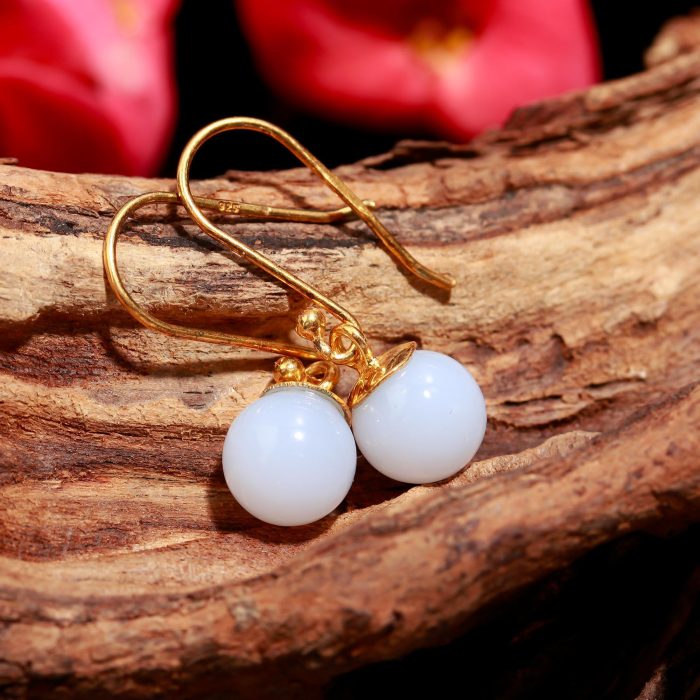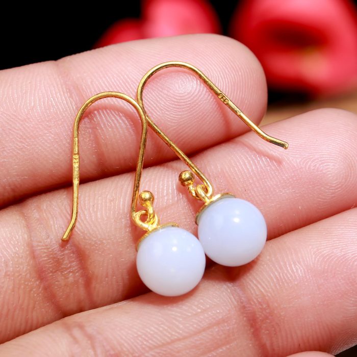 Natural White Chalcedony Balls Shape Dangle Earrings 14K Gold Jewelry Promise Gift